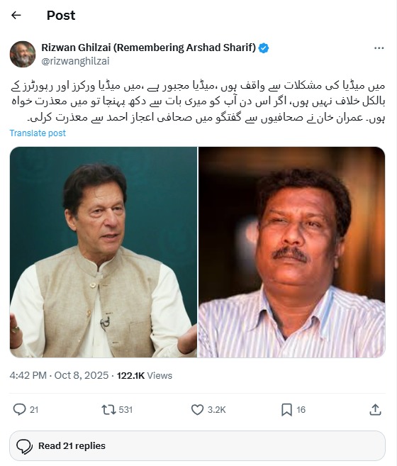 تفصیلات کے مطابق سینئر صحافی رضوان غلزئی نے ایکس پر پیغام جاری کرتے ہوئے بتایا کہ ’’عمران خان نے جیل میں صحافیوں سے گفتگو کرتے ہوئے صحافی اعجاز احمد سے معذرت کی اور کہا کہ میں میڈیا کی مشکلات سے واقف ہوں ،میڈیا مجبور ہے ،میں میڈیا ورکرز اور رپورٹرز کے بالکل خلاف نہیں ہوں، اگر اس دن آپ کو میری بات سے دکھ پہنچا تو میں معذرت خواہ ہوں۔ ‘‘