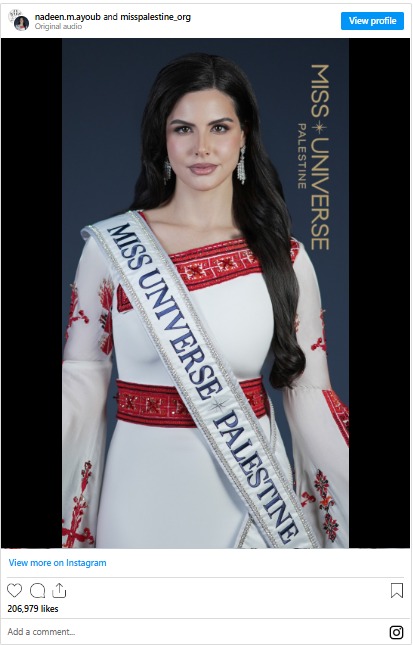 ایکسپریس نیوز کےمطابق، نادین ایوب، جنہیں 2022 میں مس فلسطین کا تاج پہنایا گیا تھا، ادب اور نفسیات میں ڈگری رکھتی ہیں۔ انہوں نے اپنی اس تاریخی شرکت کے بارے میں بتاتے ہوئے کہا کہ وہ مظلوم فلسطینی عوام کی نمائندہ ہیں جنہیں غزہ میں ناانصافی اور قتل عام کا نشانہ بنایا جا رہا ہے۔
