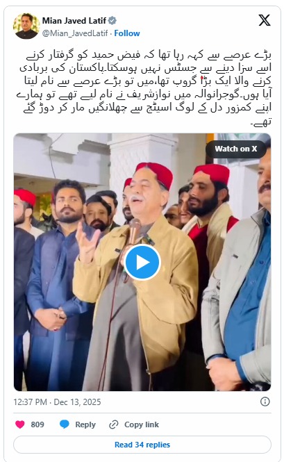 سماجی رابطے کی ویب سائٹ ایکس پر جاری اپنے ایک ویڈیو کلب میں انہوں نے کہا کہ بڑے عرصے سے کہہ رہا تھا کہ فیض حمید کو گرفتار کرنے اسے سزا دینے سے جسٹس نہیں ہوسکتا۔پاکستان کی بربادی کرنے والا ایک بڑا گروپ تھا، میں تو بڑے عرصے سے نام لیتا آیا ہوں۔گوجرانوالہ میں نوازشریف نے نام لیے تھے تو ہمارے اپنے کمزور دل کے لوگ اسیٹج سے چھلانگیں مار کر دوڑ گئے تھے۔