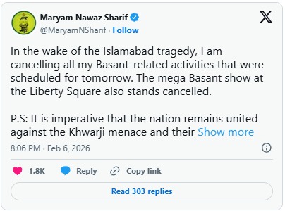 سماجی رابطے کی ویب سائٹ ایکس پر جاری بیان میں مریم نواز نے کہا کہ ‘سانحہ اسلام آباد کے پیش نظر میں بسنت کے حوالے سے کل شیڈول تمام سرگرمیاں منسوخ کر رہی ہوں’۔