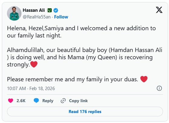 اپنے ایکس اکاؤنٹ پر حسن علی نے لکھا کہ ہیلینا، ہیزل، سمیعہ اور میں نے گزشتہ شب اپنے خاندان میں ایک نئے اضافے کو خوش آمدید کہا ہے۔ انہوں نے شکر ادا کیا کہ ان کا بیٹا خیریت سے ہے اور والدہ (ان کی "ملکہ”) بھی تیزی سے صحتیاب ہو رہی ہیں۔