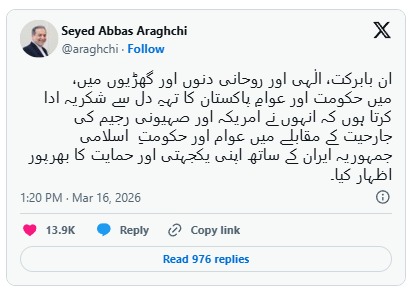 Metro53 - تہران ( ویب ڈیسک )ایران کے وزیر خارجہ عباس عراقچی نے اردو زبان میں ایک پیغام جاری کرتے ہوئے پاکستان کی حکومت اور عوام کا شکریہ ادا کیا ہے۔